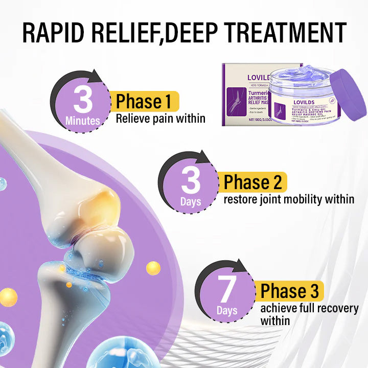LOVILDS™ Turmeric & Emu Oil Arthritis Pain Relief Massage Gel is scientifically formulated to provide fast, targeted relief for arthritis pain, helping to soothe discomfort in just 3 minutes. 💨✅ Restores joint mobility in 3 daysSupports full arthritis recovery in 7 days